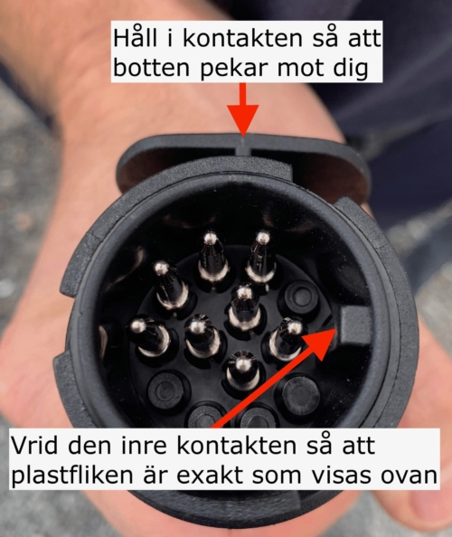 Om strömkontakten är felvriden så passar den inte i bilen eller adaptern. Se då till att den fyrkantiga lilla pluggen i den 13-poliga kontakten sitter korrekt som på bilden nedan (pluggen skall vara i position kl. 15). För att vrida pluggen tillbaka till rätt läge kan du använda en nyckel, skruvmejsel eller liknande.